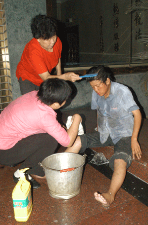隔壁一家川菜馆的老板娘,看见孕妇浑身脏兮兮的,赶紧从店里拎过来一桶热水,拿来毛巾,手把手地给孕妇洗起身子。
