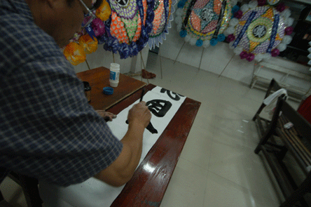 医院被设成灵堂 门口摆了几十个花圈,一位依伯在写设灵堂用的挽联