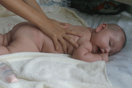 育婴师对婴幼儿的手、脚、背部的按摩,以刺激他们的末梢神经,还可起到安抚婴儿情绪的作用。