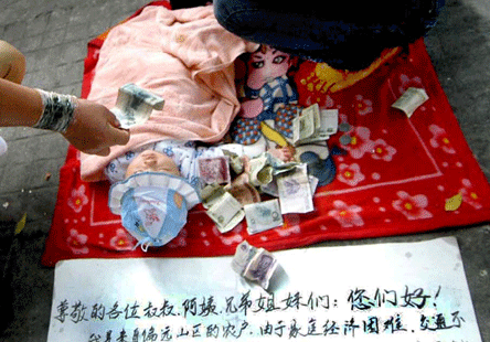 “好可怜!”路人纷纷解囊资助这位“不幸”的母亲。1元,2元,5元,10元……没几分钟时间,地面上便聚集了数十元。