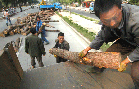 看图说话:“砰”的一声巨响,满载木材的大货车因为刹车失灵,撞上道路中间的绿化带,然后侧翻在绿化带上,整车的木材“骨碌碌”滚在公路上有30多米长,还好没砸到行人,只有司机受了点皮外伤,但宽阔的马路却被堵住了,货主请了5名工人,忙了1小时才清理干净。