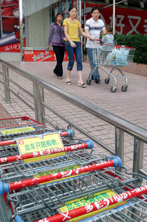 随后,记者在超市里看到,虽然购物车上有“此车只限购物,请勿让儿童乘坐”的字样,但还是有人将孩子放在购物车内购物。本报提醒读者带小孩购物不要图省事把孩子放在车内,以免悲剧发生。