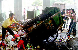 负责将垃圾送往红庙岭垃圾场的司机告诉志愿者们,该转运站负责转运南街、东街等5处的垃圾,每天有300多辆垃圾板车和45辆大卡车转运走上百吨垃圾。