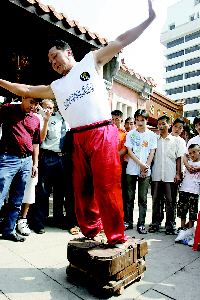 赖莹莹,今年47岁,现在晋江青阳街道青华工业区一家公司做保安。他在13岁时,就可负重60公斤的石头练脚力,后来学过五祖拳、白鹤拳。