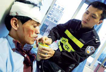 大家赶紧把他往医院送,在路上,民警薛福贵脱下警服为他包伤口,整件警服浸透鲜红的血。