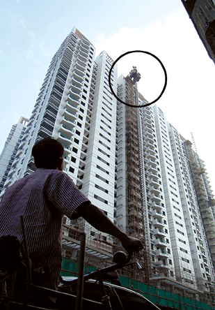 火速直击:“公司不给钱我就跳下去。”四川籍民工徐某站在施工用的升降梯里,身处28层高的楼顶。这栋楼就是美伦浩洋丽都工地尚未竣工的大楼。