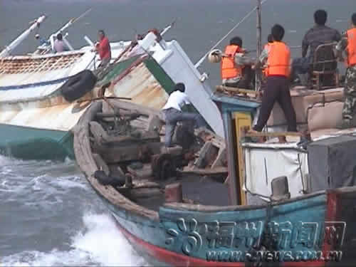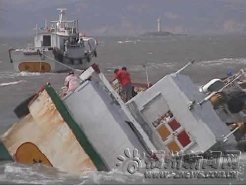 22日上午9时许,一艘的台轮在福建省平潭县东甲岛海域遇风浪侧翻下沉。接到报警,福清、平潭两地边防官兵组织船只出海营救。经过10小时的紧张营救,23日零点左右,失事台轮终于被成功拖回福清南青屿台轮码头,3名台湾船员也安全获救。 这艘台轮当日上午7时许从福清市南青屿台轮码头装载30余吨渔货后返航,然而不到2小时该船就在平潭东甲岛海域突遇海上大风浪,船体被浪打翻,渔货被倾至船体一侧后导致船体侧翻进水,台轮缓缓下沉。事发后,台轮上的3名船员一边拼命排水减缓船体下沉,一边迅速向福建省南青屿边防工作站报警求援。险情发生后,福州市公安边防支队迅速启动海上救助预案,立即指令福清南青屿边防工作站就地征用港内的另外3艘台轮出海营救,同时通知事发海域附近的平潭南中边防工作站组织当地1艘渔船出海协助营救。 经过近1个小时的急速航行和海上搜索,上午10时许营救船只终于赶到事发海域。此时,失事台轮侧翻至75度左右,海水已漫过台轮甲板,3名船员被逼至驾驶舱顶等待救援。营救船只立即靠过去,准备先将遇险船员转移。然而,此时台轮即将沉没,3名心急如焚的遇险船员坚持不下船,要求边防官兵先保船再救人。情况紧急,营救人员同意了将险船和船员一同拖离险境的营救方案。可是,在抛缆拖船时,因海上风大浪急,救援船只被巨浪颠上抛下,10厘米粗的缆绳,扔不出几米远,官兵们连续尝试了五六次也没有成功。最后,大家想了个办法,把缆绳系在木板上扔在海里,再由救援船的船员用钩子钩了上来。 由于险船船体已经严重倾斜,拖拉险船也十分危险,只要拖的方向和角度稍有不对,就会加速险船的下沉。因此,随后的营救行动一波三折。两艘大马力台轮一左一右在前面小心翼翼地拖,官兵们驾驶另1艘台轮和从南中岛赶增援的1艘渔船在两边护卫。由于风浪大,险船重,缆绳细,15分钟后,一个浪头打来,只听见啪的一声,缆绳被绷断了,断缆的一段飞卷而来,嘭的一声重重地将旁边护卫的船只砸了一道深深的凹痕,营救人员都惊出一身冷汗,因此营救行动也变得更为小心。果然,在随后的3个多小时里,缆绳又3次被绷断,但官兵们没有放弃营救,一次次地断,一次次地接,至下午2时许,险船终于被就近拉到平潭南中岛上的南中港稍停休整。 为了防止遇险船员在烈日暴晒下造成脱水,南中边防工作站官兵运来面包和矿泉水扔到遇险船上给船员补充体力,并向他们喊话,再次要求对方先转移到救援船只上。经过耐心动员,3名遇险船员终于被说服。于是边防官兵迅速用渔船靠梆,将3名台湾船只安全转移到救援船只上。 稍事休息后,营救人员和台轮继续拉着险船驶向南青屿。然而不巧的是,刚出发不久,正碰上退潮,险船被搁浅在一处浅滩上,营救行动再一次被逼中止,直至再次涨潮后才又继续。至23日零时许,救援人员终于将失事台轮及3名遇险船员安全救回目的地福清南青屿小山东码头。 此时,南青屿边防工作站官兵已在码头迎接,不仅准备了平安面,还请来医生为遇险船员检查身体。当晚,南青屿边防工作站还连夜组织15名搬运工将失事台轮上的30余吨的渔货转移到岸上仓库内,并帮助联系维修人员,尽最大可能为台胞减少经济损失。