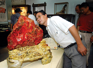昨日下午,福州东方古玩城里,“首届东方收藏精品展暨雕刻艺术品鉴定会”展出数百件瓷器、字画、石雕等精品,令收藏爱好者们好眼馋。其中一块重达20多公斤、名为“蓬莱仙岛”的鸡血石最受宠。该石是台湾著名收藏家郑宗坤先生为支持2008北京奥运,专程从台湾送到福州的。