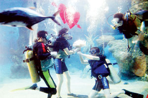 昨日上午,福州八对有情人来到海底世界,身穿潜水衣,潜入“海底”举行婚礼,让鱼儿见证他们幸福的爱情。本报记者 吴爱兰 摄影报道