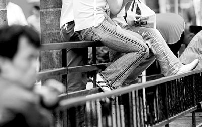 ▲骑墙 福州步行街,本来用来维护行人安全的护栏,却成了游客的椅子 本报记者 林风 摄
