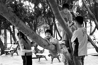 ▲攀爬 福州西湖公园,本来用来乘凉的树木,却成了孩子比攀爬技术的地方 见习记者 孙韬 李剑准 摄