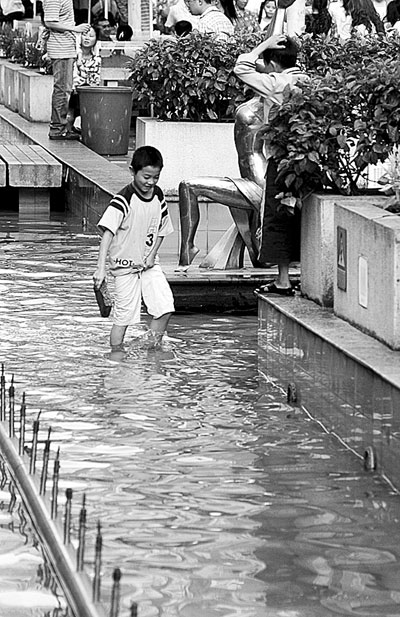 ▲嬉水 福州步行街,本来用来观赏的喷水池,却成了孩子嬉水处 本报记者 陆乙鑫 摄