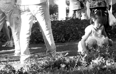 ▲践踏 福州西湖公园,小孩子采花本来就不对了,大人们也忍心践踏这么漂亮的草坪 本报记者 刘昌丰 摄