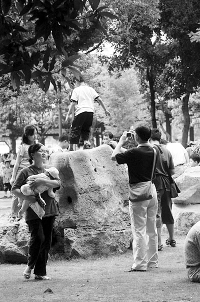 ▲拍照 福州西湖公园,照相本来也没错,何必爬得这么高呢 本报记者 毛朝青 摄