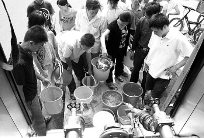 火速直击:上百个居民在一辆消防水灌车前排起了接水长龙,老人、年青人、小孩一起上阵,带着水桶、脸盆、水瓶、煮水壶、锅,把家中所有能装水的东西都拿来接水了。原来,该小区从前天就开始停水了,而检修人员又一直找不到故障,最后只好让消防车送水过来,以解居民燃眉之急。