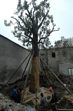 目前,该地方正在拆迁。记者在现场看到,该树树干直径有80多厘米,树的枝干已经被人砍掉,五六个农民工正在挖树根,已挖了1米多深。
