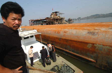 昨日,记者在现场看到,往湾边大桥建设工地下游300米处望去,倾覆的运砂船浮在江面上。