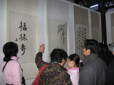昨日上午,福建省诗词学会、省书法家协会、省美术家协会与西湖开化寺联合举办新春诗书画展,吸引了大批西湖的游客前往参观。