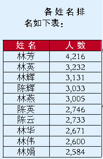这项统计数据表明:本市户籍人口中叫“林芳”的最多,共有4216人。排在前10位的姓名依次是:林芳、林英、林辉、陈辉、林燕、陈英、陈云、林华、林伟、林娟。