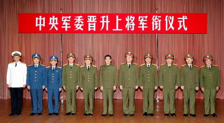 新华网北京7月6日电 (记者曹智) 中央军委6日在北京八一大楼隆重举行晋升上将军衔仪式。中央军委主席胡锦涛向晋升上将军衔的同志颁发命令状。